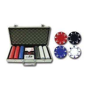 This All In One Professional Poker Chip Set Includes: 300pc 11.5g Heavy weight Clay/Abs Composite "SUITED" chips, Deluxe Heavy Duty Aluminum Case, 2 Decks of Casino Quality Cards, 5 19mm Casino Size Dice, and 1 Dealer Button. Chip Colors & Quantity: 100 White Chips, 100 Red Chips, 50 Blue Chips, and 50 Black Chips.300 piece poker chip set "Suited Design" 11.5g clay composite in lockable silver case with Dealer Button Specifications