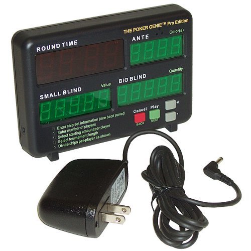 The Poker Genie is a poker tournament clock that electronically displays the time remaining in the current blinds level, the ante and the small and big blinds. It is a hardware-based blind timer that will also help set up your poker tournament. The Poker Genie will automatically calculate your blind schedule and tell you how many chips of each color to issue each player. It will estimate how long your tournament should last and ... it does all this within a minute or two. You can also use The Poker Genie to display your own custom blind schedule. You can enter your own blinds, antes, and level lengths, allowing more experienced players to use The Poker Genie as an excellent wall-timer that displays the blinds and antes. No more "How much time is left?" or "What is the big blind?" questions.Available at Amazon Check Price Now!