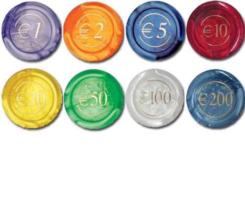 These authentic Italian composite chips from Modiano weigh in at 4 grams each. Each chip has a marbled style. Use these chips for poker, blackjack, craps or any other game with betting. Comes in 8 different Euro denominations, including: 1, 2, 5, 10, 20, 50, 100, and 200. These come in plastic wrapped rolls of 25. Please order in multiples of 25.We also have the Dollar version of these chips sold in our Amazon Store.NOTE: PLEASE CHOOSE DENOMINATION VIA EMAIL AFTER PURCHASE. YOU MUST CHOOSE IN SOLID ROLLS OF 25 CHIPS (YOU CAN CHOOSE UP TO 4 BOXES OF DIFFERENT DENOMINATIONS PER ORDER OF 100).Available at Amazon Check Price Now!