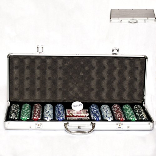 Aluminum chip case set, contains 500 11.5g two-tone dice poker chips, 5 red 16mm dice and 2 decks of cards.Available at Amazon Check Price Now!